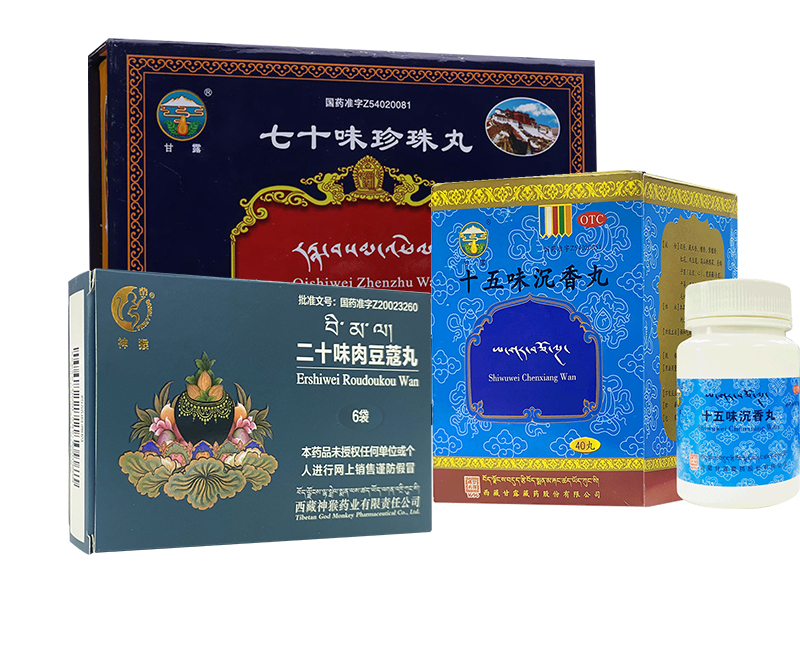 组方简介:十五味沉香丸主治调和气血,止咳,安神。用于气血郁滞,胸痛,干咳气短,失眠。七十味珍珠丸微丸主治安神,镇静,通经活络,调和气血,醒脑开窍。用于“黑白脉病”、“龙血”不调;中风、瘫痪、半身不遂、癫痫、脑溢血、脑震荡、心脏病、高血压及神经性障碍。二十味肉豆蔻丸主治镇静、安神。用于"宁龙"病引起的神志紊乱、